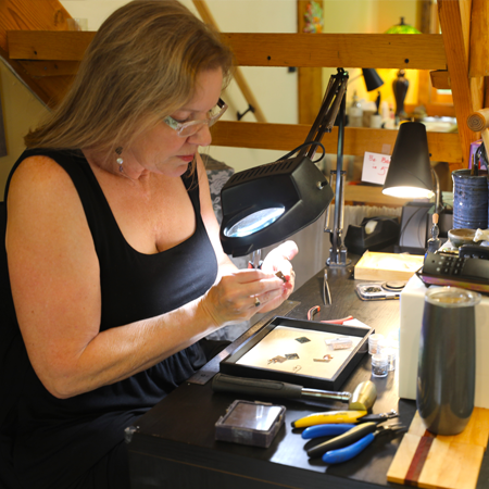 At Indigo Swan Jewelry & Fine Art, you will find an “earring bar” set up just for the tour. One-of-a-kind components and a vast selection of gems will be on display for you to choose from. Design your own earrings (or necklace) and Ann will assemble it for you! Ann Mooney’s gallery carries jewelry and art by artists from around the world. The air is joyful at Indigo Swan Jewelry & Fine Art! Ann isa multi-media artist concentrating on jewelry. She works in most metals with many of your favorite gems and of course, pearls!