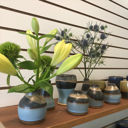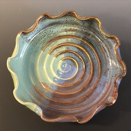Much of Anne Scott Plummer's functional pottery, created at Island City Clayspace in Winona, MN, evokes a mid-century modern style. Mugs, bowls, vases, plates, planters, and special forms such as brie bakers, pasta serving bowls, ramen bowls, ceramic watering cans, and more are available. Color-saturated, satin glazes are velvety to the touch, and some simple white or black forms are accented with bright colors. Glossy greens and blues reflect the nearby Mississippi River. There is a series of serving plates and platters that feature honeycomb and honey bee motifs. Many pieces are decorated in underglaze with images of food, insects, animals, and nearby landscapes. All pottery is food-safe, and can be put in the dishwasher, microwave, and oven. Plummer pays close attention to functionality - how a piece balances in the hand or how the rim of a mug feels against the lips. Plummer's abstract, figurative sculptures are ceramic, created by throwing, hand-building, and/or casting clay. Their surfaces sometimes tell a story through hand-painted imagery.