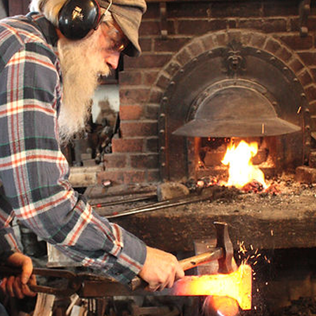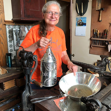 The Latané's have been making decorative hardware and utensils inspired by historic designs, of steel and tin, in their Pepin shop for over 40 years. Tom's work is distinctive because of his attention to fine detail. Kitty is known for her tin cookie cutters and ornaments.