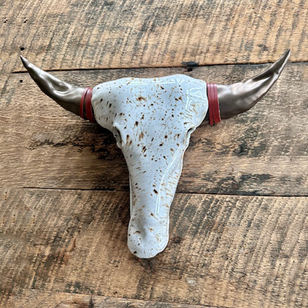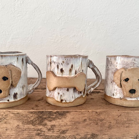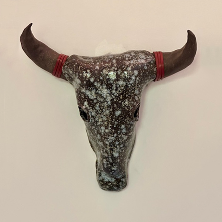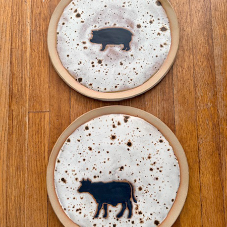 My work is influenced by my childhood memories of growing up on a farm and my love of animals. My most unique clay creations are steer head sculptures with horns. After bisque fired, the steer sculptures are glazed in several different ways and a few are finished in a firepit for a distinctive look. The studio is lined with a collection of plates that I have created, many of which feature farm animals. Dog dishes and mugs for dog lovers are created in honor of my puggle, Betty.